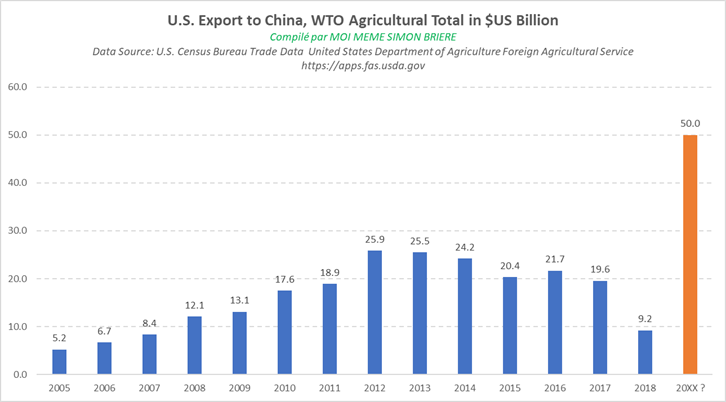 Je suis allé sur le site de l’USDA pour comptabiliser les chiffres depuis une couple d’années car je ne voulais pas faire l’argument de comparer bêtement avec 2018 car sachant très bien que l’exportation a été tellement faible que les comparaisons allaient être boiteuse. J’ai pris les chiffres totaux des exportations agricoles pour la Chine ; j’y ai mis la totale, pas juste le porc et le soja. Vas-y Marcel mets en on va voir ; du soja, du coton, du porc, du bœuf, des noix, des légumes, du tabac, du chocolat, du thé, du jus d’orange, let’s go etc… Mets-en c’est pas de l’onguent comme dirait grand-père. On compilant tout ça, on remarque que jamais les exportations vers la Chine ont réellement dépassé 25 milliard par année.