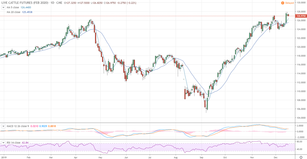 Malgré tous les appels répétés des spécialistes de l’industrie qui clamaient que les prix du bœuf étaient beaucoup trop élevés, les contrats à terme n’ont que faire de ces idées puisque ceux-ci sont constamment à la hausse. Il semble bien que les fonds d’investissement et les abattoirs y voient une opportunité d’acheter cher et de vendre encore plus cher! Les contrats à terme se transigent à des primes supérieures au prix au comptant et de façon importante par rapport à l’historique des écarts. Les prix au comptant transigent entre $117 et 120 au Nebraska alors que la moyenne des prix (5-area) se situe à $119.17. L’an dernier les prix se situaient autour de $118.14 USD / 100 livres. Le poids moyen est aussi 10 livres supérieur cette année. Encore une fois, les négociants essaient de rationaliser la demande potentielle chinoise en propulsant les prix à la hausse. Pourtant, malgré les espoirs portés par cette demande, la réalité demeure que les exportations américaines sont en baisse cette année dans ce produit spécifique (-4.2%) (contrairement au porc et poulet).