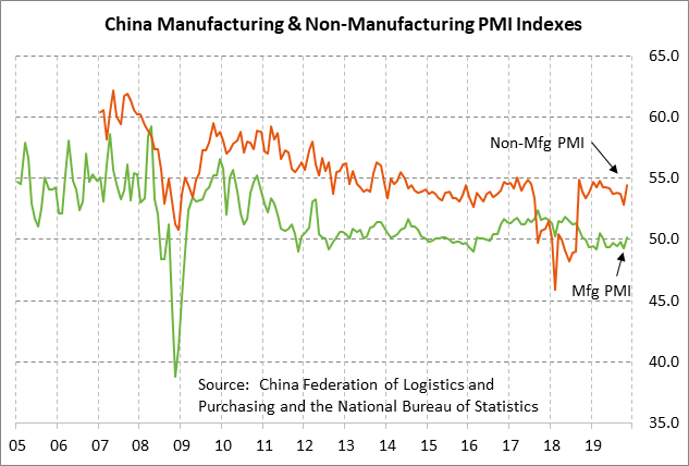 Le PMI chinois devrait fléchir - Le consensus veut que les rapports nationaux chinois PMI de lundi soir (ET) montrent de légères baisses mais restent au-dessus du niveau d'expansion-contraction de 50,0. Le PMI manufacturier chinois de décembre devrait fléchir de -0,1 point à 50,1. La hausse de +0,3 à 50,2 en novembre a remis l'indice au-dessus du niveau de 50,0 pour la première fois depuis avril.