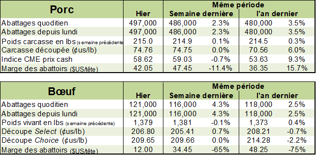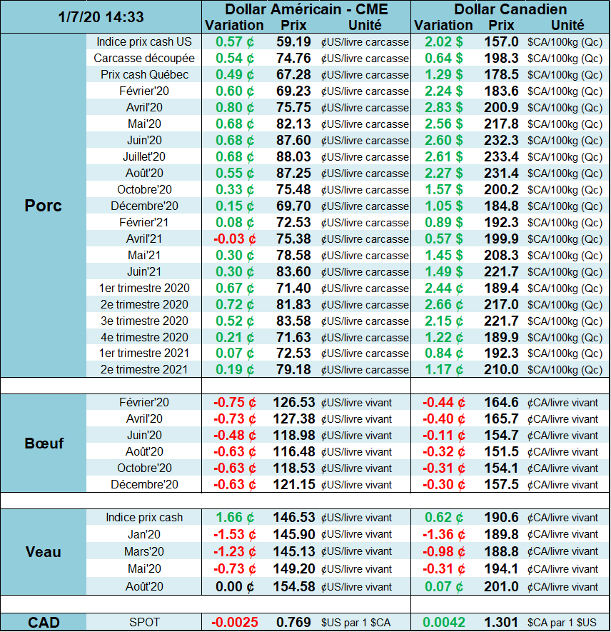 En fait, le débat est relancé au sujet des anticipations des contrats à terme versus le prix au comptant. Les participants commencent à réduire les espoirs de voir des prix de porc exceptionnels en 2020. Les prix ont donc tendance à dégonfler tranquillement. Réellement ce sont encore les contrats court terme qui encaissent le coup. Ainsi donc, les contrats de février et avril 2020 demeurent très fragiles et pourraient diminuer plus rapidement que les mois plus éloignés. Le prix au comptant demeure très bas et se négocie à $59.15 USD / 100 kg alors que le contrat à terme de février se transige à 68.00 USD / 100 kg. Et cela à 5 semaines de l’échéance. Il y a donc du rattrapage à faire. La découpe demeure quant à elle autour de $74.00 USD / 100 kg. Rien de bien excitant de ce côté aussi.