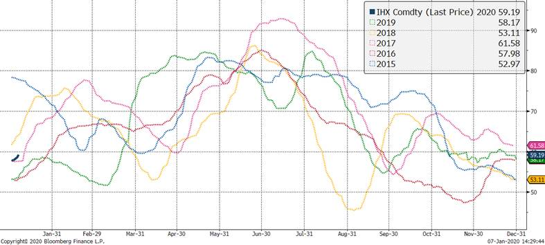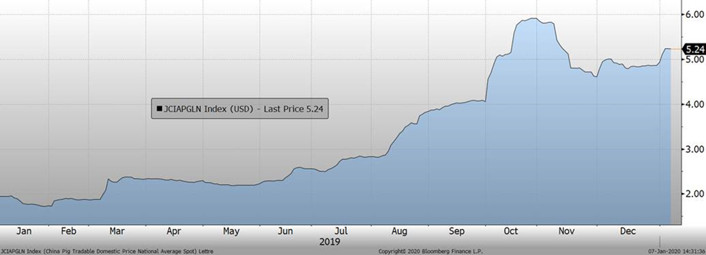 Contrairement au porc, les prix ont repris leur ascension contre toute attente. Quand on regarde un graphique, la situation technique des contrats à terme de bœuf est très positive pour une continuité. Par contre, les fondamentaux ont plus de difficulté à justifier une telle embellie. Le prix moyen des 5 zones se situe à $124.21 USD /100 kg versus $122.28 la semaine dernière. La production de viande de bovins s’est chiffrée à 450.7 millions de livres versus 440.2 millions de livres l’année précédente. Le poids moyen se maintient à 828 livres versus 825 l’an dernier. Les exportations de viande de bœuf terminent l’année 2019 sur une note très décevante. De plus, les détaillants ne semblent pas vouloir faire la promotion du bœuf en janvier et février alors que les commandes de ceux-ci sont en chutent libre de plus de 23% par rapport aux niveaux des dernières années. A moins que cette viande ne soit destinée à une autre catégorie d’acheteur? Les ventes pour les plus longues périodes sont en baisse de 18% et 34% respectivement (vente d’avance 61-91 jours et plus de 90 jours). Ce sont des données à garder en tête à un moment ou les bêtes (en hausse) dans les parcs seront destinées aux abattoirs durant ces mois.