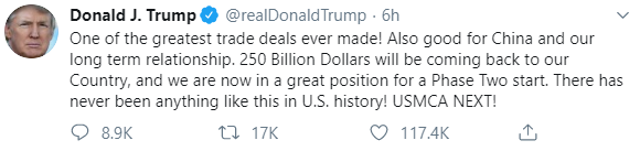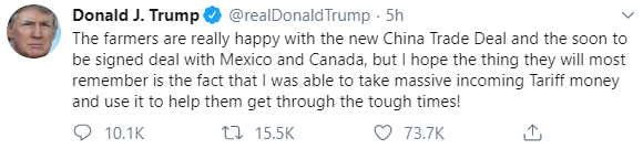 Signature du deal Phase 1 avec la Chine – Yayyyyy! La Chine va acheter pour 35 à 45 milliard de denrées agricoles sur les deux prochaines année. C’EST UN RECORD!
