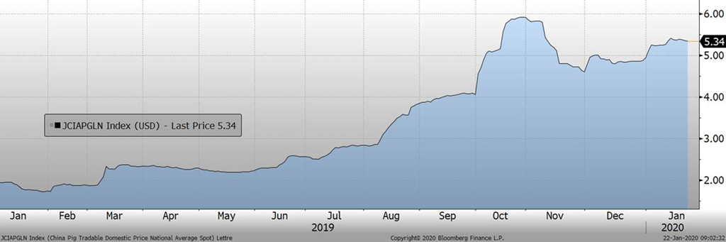 La Chine continue de liquider leur inventaire surgelé afin d’augmenter l’offre de viande en prévision d’une forte demande durant le nouvel an chinois. Pékin a annoncé la vente de 20,000 tonnes de porc congelé mardi ce qui un bel effort, mais représente des peanuts à l’échelle nationale. Mon interprétation sur la vente de porc surgelé du gouvernement chinois est que les congélateurs vont être vides à la fin du nouvel an chinois et qu’on pourrait voir les chinois augmenter la cadence d’importation pour rebâtir les réserves dans les prochaines semaines. Cependant, les taxes de représailles sont toujours en vigueur sur le porc américain, il reste donc à savoir quel sera l’impact de l’accord de phase 1 sur la demande de porc.