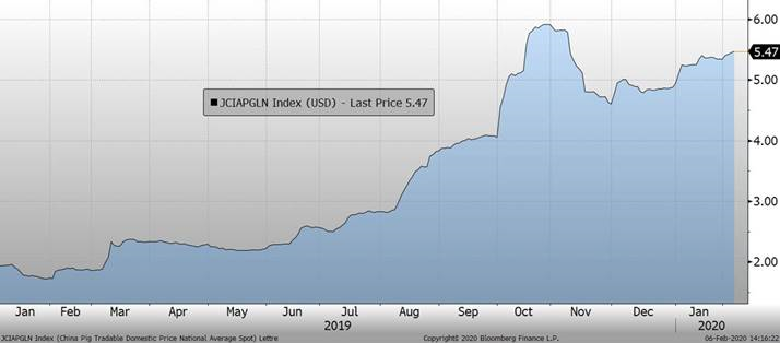 - Le prix du porc en Chine n’a pas diminué et se maintient à $50 USD/100 kg des sommets réalisé en octobre 2019. On se situe encore à $550 USD / 100kg