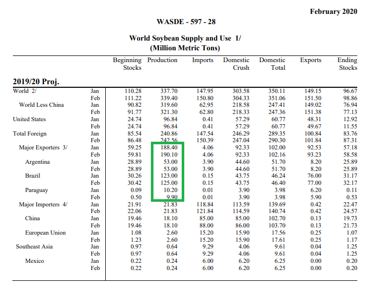 L'USDA a mis à jour ses bilans et les récoltes d'Amérique du Sud ont (encore) été revues à la hausse. L'an passé ils ont sorti 184 millions de tonnes, un record. Cette année c'est rendu 188 millions.... la machine roule full pinne.