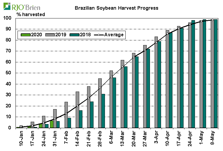 Bien que l'entente kick demain, les récoltes en Amérique du Sud vont elles aussi commencer bientôt. D'ailleurs le Brésil est déjà dans le champs et 7% de la binne est sortit (en date du 31 janvier).... donc j'imagine qu'on doit etre facilement rendu à 20-30% en ce moment.