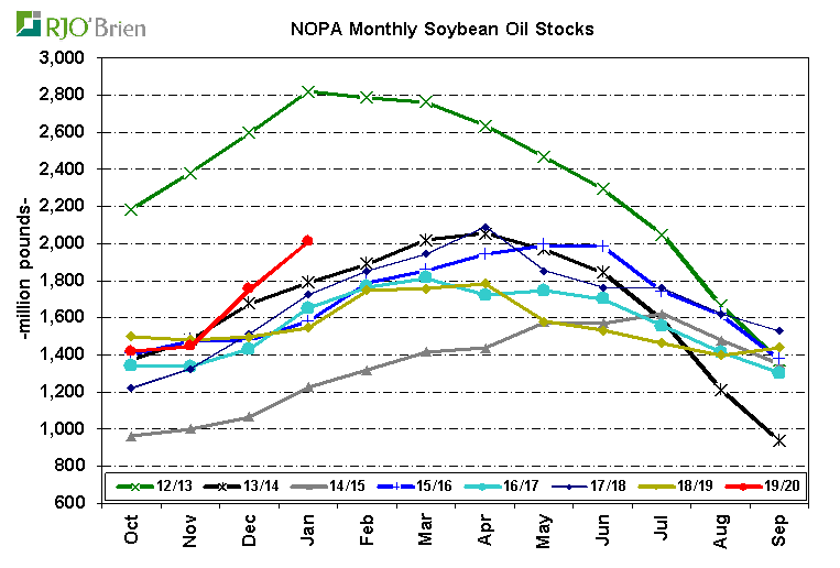 Le rapport du NOPA sur broyage de soya de janvier a été plus élevé que prévu et a établi un nouveau record historique, entraînant une production mensuelle record d'huile de soja qui, à son tour, a entraîné une forte augmentation des stocks d'huile de soya au plus haut niveau de janvier en 7 ans et le deuxième plus élevé stocks pour n'importe quel mois depuis avril 2014.