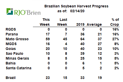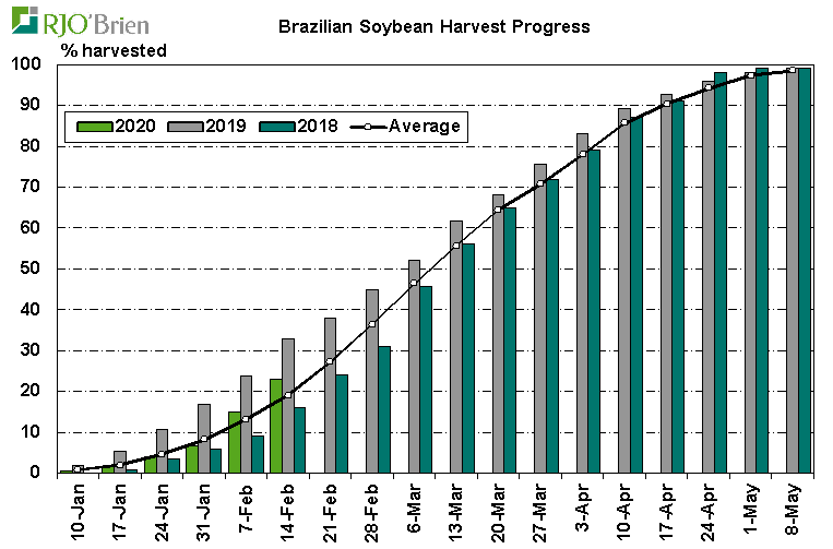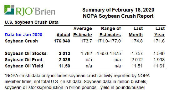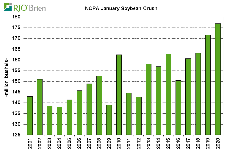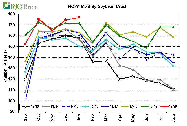 La NOPA a rapporté que ses membres avaient écrasé 176,9 millions de boisseaux de soya en janvier, bien au-dessus des attentes moyennes du marché de 173,7 millions, en forte hausse par rapport à 174,8 millions en décembre, 3,1% de plus que les 171,6 millions de boisseaux de l'an dernier et reflétaient un nouveau record absolu pour la NOPA. Au cours des derniers mois, la trituration à l'échelle des États-Unis a été en moyenne de 5,8% supérieur aux opérations des membres de la NOPA, ce qui impliquerait un volume broyé de 187,2 millions de boisseaux à l’échelle national, ce qui dépasserait le record actuel de 187,0 millions établi en octobre 2019. D'après cette estimation, septembre-janvier à ce jour, l'écrasement de 896 millions de boisseaux serait essentiellement inchangé par rapport aux 898 millions de l'an dernier et nécessiterait une trituration de février à août supérieur par +1,2% à celui de l'an dernier pour que l'estimation de l'USDA 2019/2020 de trituration annuel de 2,105 milliards de boisseaux soit atteinte . Outre le lent démarrage de l'année au cours de laquelle l'écrasement de septembre a baissé de 5,1%, l'écrasement au cours des quatre derniers mois a été en moyenne de +1,4% supérieur aux niveaux de l'an dernier.