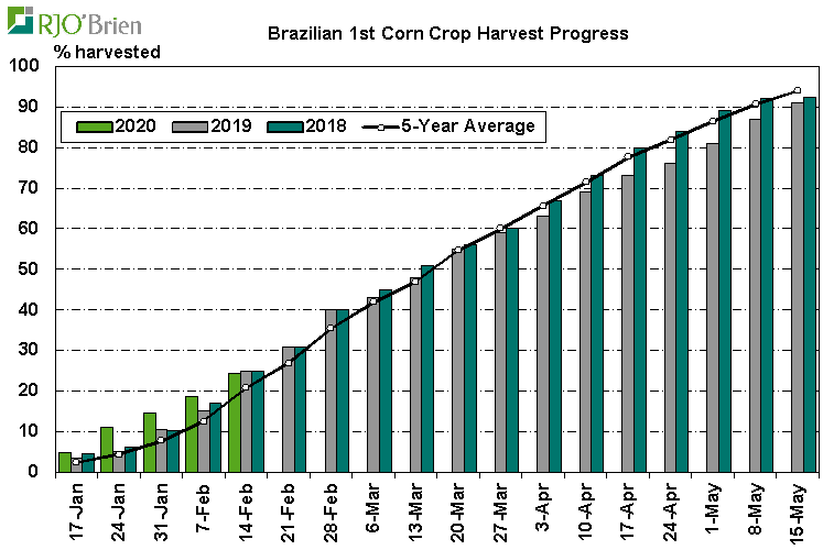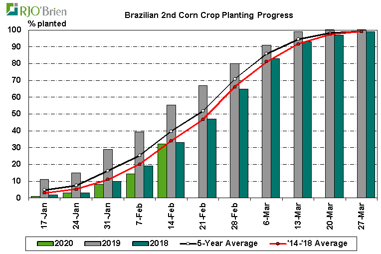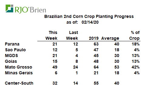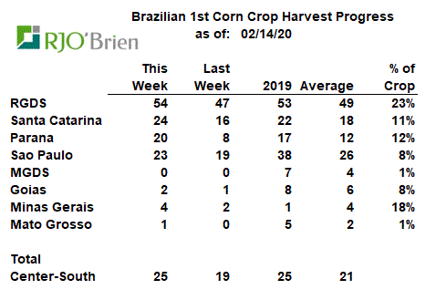 Tout progresse à un bon rythme au Brésil. La moisson du soya est complétée à 23% et celle de la première récolte de maïs à 25%, ce qui représente une petite avance sur la moyenne quinquennale. Cependant, il y a un léger retard pour l’ensemencement de Safrinha (deuxième récolte de maïs), complété à 32% versus 55% et 40% en 2019 et en moyenne, respectivement.