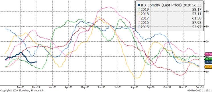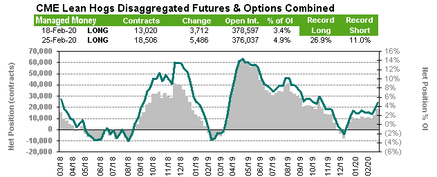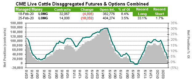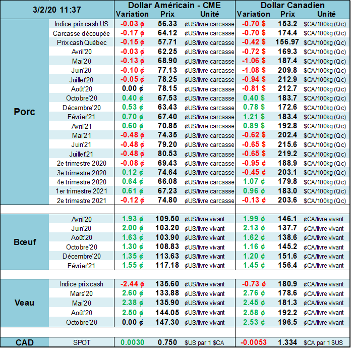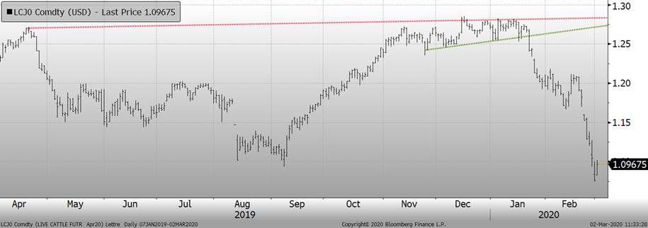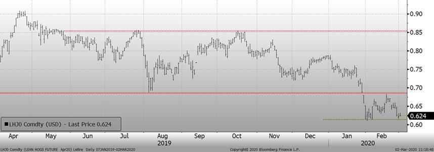 Le marché remet en question les creux de contrats et craint toujours que les porcs ne reculent aux États-Unis «si» les exportations ralentissent. Cependant, les ventes hebdomadaires à l'exportation ont atteint un sommet pour l'année à la fin de la semaine dernière avec des ventes de 38,900 tonnes. Les prix au comptant et des découpes restent instables mais sont restés inchangés au cours des deux dernières semaines, ce qui est relativement « bon » lorsqu’on compare aux indices de matières premières qui ont absorbé une baisse de 8% la semaine dernière. Les prix des porcs chinois ont baissé de 0,9% aujourd'hui, mais sont toujours en hausse de 8,6% depuis le début de l'année et de 198% par rapport à il y a un an. Si les craintes virales commencent à ralentir, le marché pourrait être en position de rebond significatif. Alors que les fondamentaux à court terme semblent s'améliorer au cours des prochains mois, les traders restent préoccupés par le fait que la propagation du coronavirus à travers le monde entraînera un ralentissement du commerce mondial et avec des exportations américaines près de 25% de la production totale, un ralentissement du commerce mondial pourrait faire mal au prix du porc américain. Les porcs d'avril ont clôturé modérément à la baisse vendredi et le marché teste dans les plus bas de février. Une nouvelle baisse des prix boursiers des bovins vers un nouveau bas de contrat a ajouté à la pression baissière.
