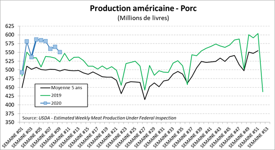L'USDA a estimé l'abattage de porcs à 486 000 têtes vendredi et 91 000 têtes samedi. Cela a porté le total de la semaine dernière à 2,556 millions de têtes, contre 2,622 millions la semaine précédente mais contre 2,437 millions il y a un an. La production de porc pour la semaine a augmenté de 3,4% par rapport à l'an dernier.