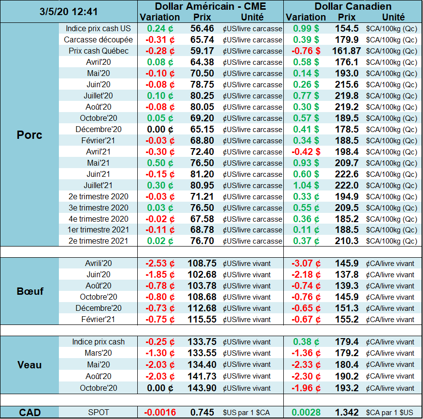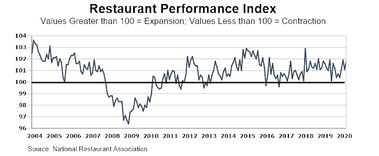 Les cours des contrats à terme des bouvillons sont étroitement aux fluctuations boursières reliés au Dow Jones ou au S&P 500. On parle souvent de l’effet de richesse ou de ruissellement que les bonnes performances boursières provoquent dans l’économie réelle. Le prix du bœuf est directement impacté par cet effet. Le problème présentement demeure que l’économie mondiale et américaine pourrait rouler au ralenti et ce pour encore plusieurs semaines. Tourisme et la restauration sont les premiers touchés par les mesures de confinement et de quarantaine. Ainsi si les gens fréquentent moins les restos, la consommation de viande de bœuf va avoir tendance à diminuer. Le Restaurant Performance Index sera intéressant à décrypter. Les données de janvier montrait une hausse de 0.7% pour se situer à 101.8. Quand l’indice se situe au-dessus de 100, c’est le signe que l’industrie est en expansion et sous le niveau de 100, les restos sont en mode contraction. En janvier, les restaurateurs envisageait une croissance de l’indice à 102 sur un horizon 6-mois.