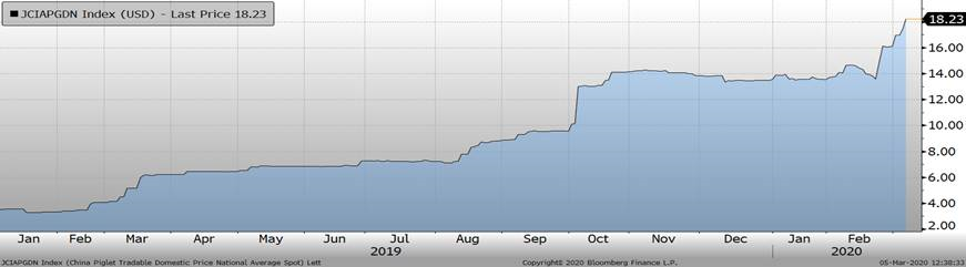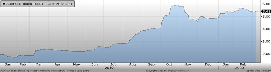 Incidemment, le pays pourrait voir sa production porcine en 2020 réduire entre 15 & 20% par rapport à 2019. Les importations en 2019 ont augmenté de 67%. Les 3 principaux pays fournisseurs auront été l’Espagne, l’Allemagne et les Etats-Unis. De plus, à l’échelle mondiale, on prévoit une diminution de 10% de la production.
