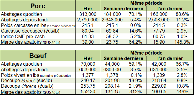 Pour l’instant, les abattoirs ne dérougissent pas et abattent le plus possible alors que les marges sont à un sommet des 5 dernières années. Simplement la semaine dernière le prix de la découpe a augmenté de 18%. Par la force des choses, le nombre de lots négociés par les grossistes ont eux-aussi atteint une frénésie pour 1 semaine avec des lots de 702. Les animaux reçus dans les abattoirs ont augmenté de 2.6% par rapport à l’année dernière en atteignant 653 000 bêtes. Le poids moyen fut de 832 livres versus 801 livres l’an dernier.