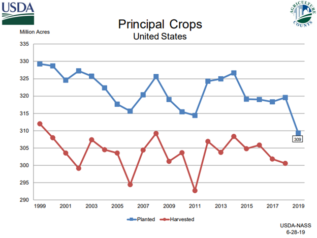 Si j’additionne les acrages de maïs (94) soja (85) et blé (45) j’arrive à 224 millions d’acres – en plein dans la moyenne des années 2014-2018 – et une augmentation de 14 millions d’acres vs l’an dernier.