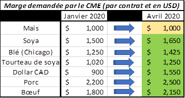 Pour bien gérer les risques et la volatilité, la Bourse a aussi changé les marges requises pour négocier des produits. On voit bien que les marges ont augmenté au cours des derniers mois sur plusieurs produits agricoles que vous êtes susceptibles d’utiliser dans votre gestion de mise en marché. La Bourse change les marges pour assurer l’intégrité financière des marchés. Les marges demeurent tout de même relativement abordables puisqu’elles représentent souvent 3% à 6% de la valeur totale d’un contrat financier (example : sur le dollar CAD, la marge requise est 2%). Ces changements ont un effet direct sur vos comptes de courtage.