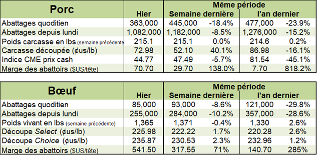 - Ces fermetures d’usines entrainent deux conséquences : (1) un nombre réduit de porcs abattus. Pour la semaine, le USDA dénombre un abattage de 1 082 000 porcs versus 1 284 000 l’an dernier. C’est 200 000 porcs de moins! Il ne faut pas oublier que le rythme en 2020 était d’au moins 3 à 4% supérieur à 2019 pendant les premiers mois de l’année. Donc il reste un nombre élevé de porcs dans les bâtiments américains.