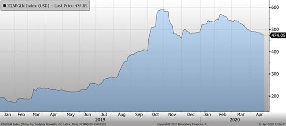 - La Chine continue d’acheter des viandes sur les marchés mondiaux. Aux Etats-Unis, les ventes à l’exportation se situaient à 39 800 tonnes métriques. Les quantités ayant quitté les ports américains se situaient à 40 900 tonnes métriques. Pour le mois de mars, la Chine a acheté 390 000 tonnes. Quand on regarde le premier trimestre de 2020, les achats se situent à 950 000 tonnes. Si la tendance se maintient ainsi, la Chine pourrait importer 3.8 millions de tonne cette année! (l’an dernier, le pays avait importé 2.1). Ce rythme d’importations serait presque 1 million de tonnes de plus que les anticipations des analystes.