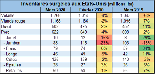 - Le rapport Cold Storage publié hier peut être considéré comme positif puisque la demande durant le mois de mars a fait diminuer grandement les inventaires abondants que le marché trainait depuis le début de l’année 2020. Les inventaires se situent à 621.9 millions de livres en hausse de 2.2% par rapport 3 2019 et en hausse de 1.9% par apport à la moyenne 5 ans. La grande demande domestique durant le mois de confinement contribue beaucoup à cette situation. Nous verrons en avril si la tendance se poursuit.