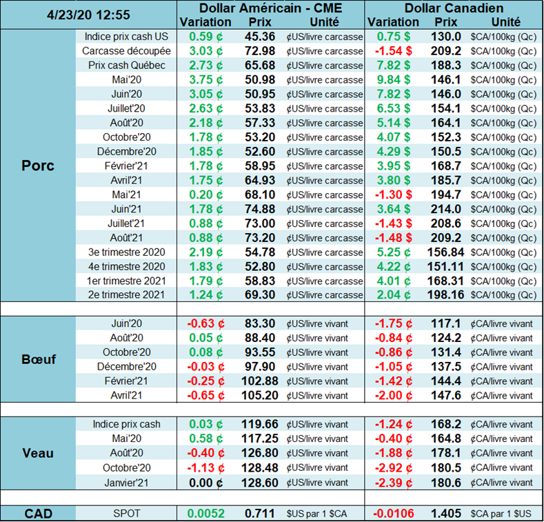 - Si ceci s’avère la réalité, il est bien possible que le nombre de porcs prévus pour le dernier trimestre de 2020 seront à surveiller puisque le dernier Hog & Pig prévoyait une hausse de production de plus 4%.