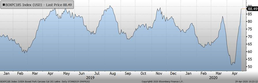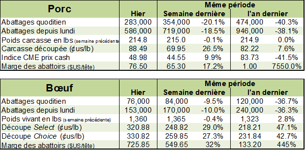 Hier, les abattages de porc totalisaient seulement 283,000 têtes comparativement à 471,000 l’an dernier. Depuis le début de la semaine, les abattages totalisent 586,000 porcs comparativement à 719,000 la semaine dernière et 939,000 porcs l’an dernier. Cela signifie que l’offre de viande sera très limité cette semaine et qu’on aura des abattages à des niveaux historiquement bas. En parallèle, le prix des découpes de porc a bondi de +4.78 c/lb hier, pour atteindre 88.49 c/lb… on parle d’un rebond de 36.5 cents depuis la mi-avril!