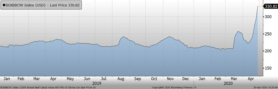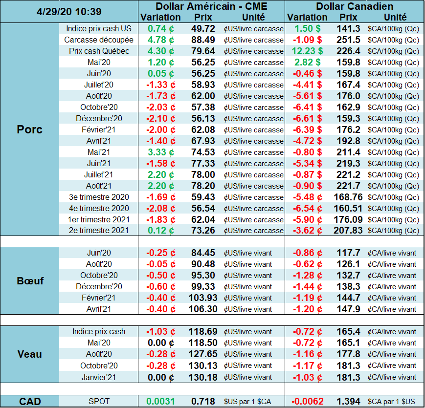 Il faut comprendre que les problèmes d’abattage touchent toutes les viandes (bœuf, porc, poulet et dinde). En coupant subitement la disponibilité de protéine par -25% sur l’ensemble du marché américain, c’est un choc de production jamais observé et c’est difficile de dire jusqu’où la valeur des viandes (après abattage) peuvent grimper, mais le potentiel haussier est là. Cependant, il faut garder en tête que les prix à la bourse sont pour les animaux vivants (avant abattage) et n’offrent pas la même dynamique que le marché des découpes. Particulièrement pour le bœuf dont les animaux sont gardés en parc plutôt qu’être euthanasiés, de même que les avortements puisque la gestation de la vache est bien trop avancée (et long) pour être avorter et le veau en question pourra rester en pâturage. Il y a donc plus de chance de voir le refoulement de la production arriver sur les marchés dans quelques semaines/mois pour le bœuf que pour le porc.