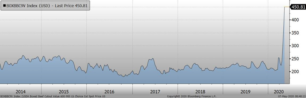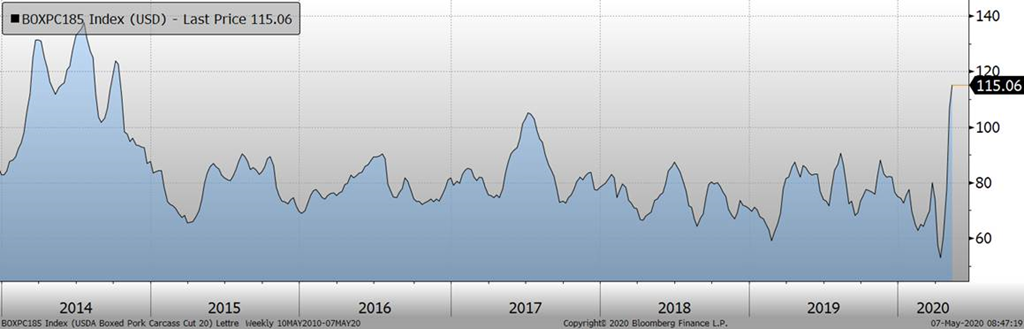 Encore cette semaine, les abattages sont extrêmement faibles (voir tableau ci-dessus). L’effet de rareté sur les tablettes d’épicerie ne se dissipera pas de sitôt et le prix des découpes le confirme. La découpe de bœuf (choice) continue son ascension vers la lune, à 4.50 $US/lb, soit 2.00 $US/lb de plus que les sommets de 2014! Dans le porc, c’est un peu moins extrême bien que l’ascension est importante et on ne peut dire jusqu’où ça continuera. La découpe de porc est rendu à 1.15 $US/lb, toujours en-dessous de la valeur de 2014 à 1.38 $US/lb. En moyenne, le prix des découpes de bœuf est 2.8x plus dispendieuse que celle du porc. Question d’en faire rêver certains, si jamais cette relation revient à 2.8x, ça voudrait dire que le prix de la découpe de porc serait à 1.60$US/lb ou 413 $CA/100kg avec la nouvelle formule de prix… le mois de mai sera la plus importante pénurie de viande aux États-Unis et personne ne peut prédire les top des prix des découpes. C’est quoi votre prédiction?
