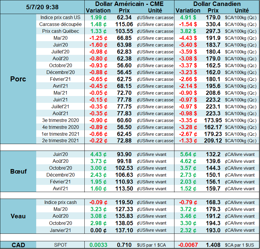 D’une part, le président Donald Trump a déclaré mercredi qu'il avait exhorté le ministère de la Justice à enquêter sur les allégations selon lesquelles l'industrie des abattoirs de viande avait enfreint la loi antitrust parce que le prix que les abattoirs paient les agriculteurs pour les animaux avait baissé alors que les prix de la viande (cutout) augmentaient. Le Président a déclaré aux journaliste "J'ai demandé au ministère de la Justice de l'examiner. ... Je leur ai demandé de l'examiner très sérieusement, car cela ne devrait pas se produire de cette façon et nous voulons protéger nos agriculteurs", lors d'un événement à la Maison Blanche en présence du secrétaire à l'Agriculture Sonny Perdue et du gouverneur de l'Iowa Kim Reynolds. Cette nouvelle pourrait venir supporter les prix des contrats à terme dans l’optique que les abattoirs pourraient enchérir les prix d’achat, tel qu’observé hier et ce matin dans le bovin. Rappelons que les marge des abattoirs sont de 104 $US/porc et 645 $US/bœuf, bien que le volume abattu soit nettement inférieur à la normale et ne reflètent donc pas la rentabilité des opérations de découpage.