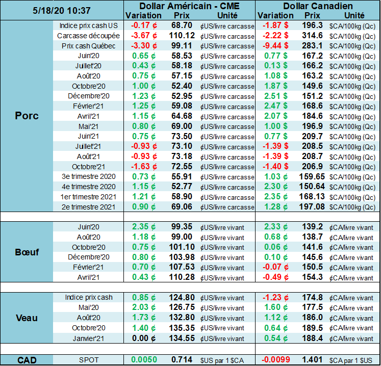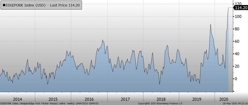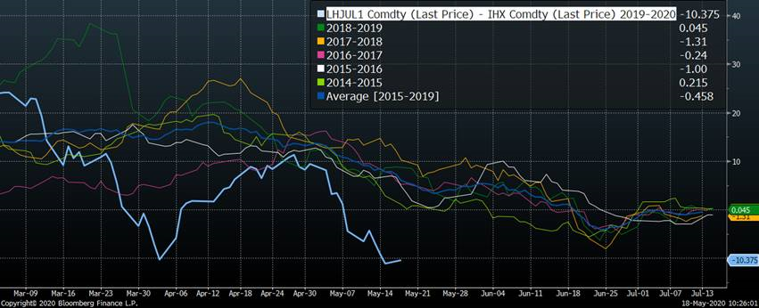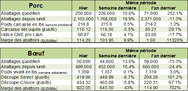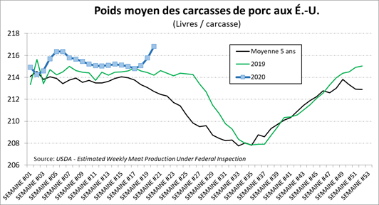 Le marché est à la recherche d'un creux à court terme, car les valeurs des découpes commencent à faiblir de prix très élevés récemment atteints puisque les activités d’abattage reprenne du gallon, bien que les volumes restent plus faible qu’à la normale. L'abattage de porc estimé par l'USDA s'est établi à 375 000 têtes vendredi et 250 000 têtes samedi. Cela a porté le total de la semaine dernière à 2,103 millions de têtes, en hausse de 18,5% par rapport à la semaine dernière mais toujours en baisse de 10,6% par rapport à l'année dernière. Alors que les prix des coupes dégonflent, l'indice du prix cash continue de grimper et laisse les porcs de juillet à un escompte important comparativement au marché comptant.