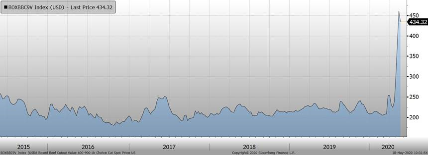 La découpe de bœuf en boîte de l'USDA était en baisse de 14,12 $ à la mi-session vendredi et a clôturé en baisse de 16,60 $ à 434,32 $. Ce montant était en baisse par rapport à 460,88 $ la semaine précédente et était le plus bas de la découpe depuis le 5 mai. La coupure est en baisse de 41,07 $ par rapport à son sommet du 12 mai.
