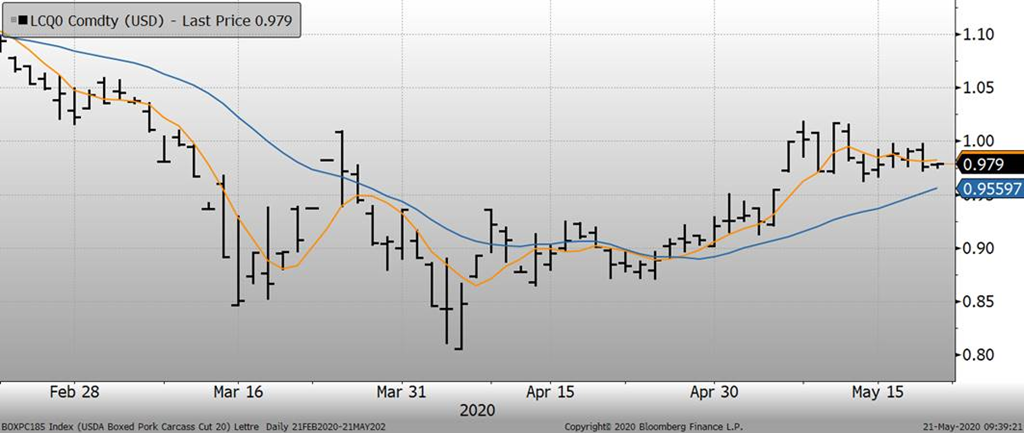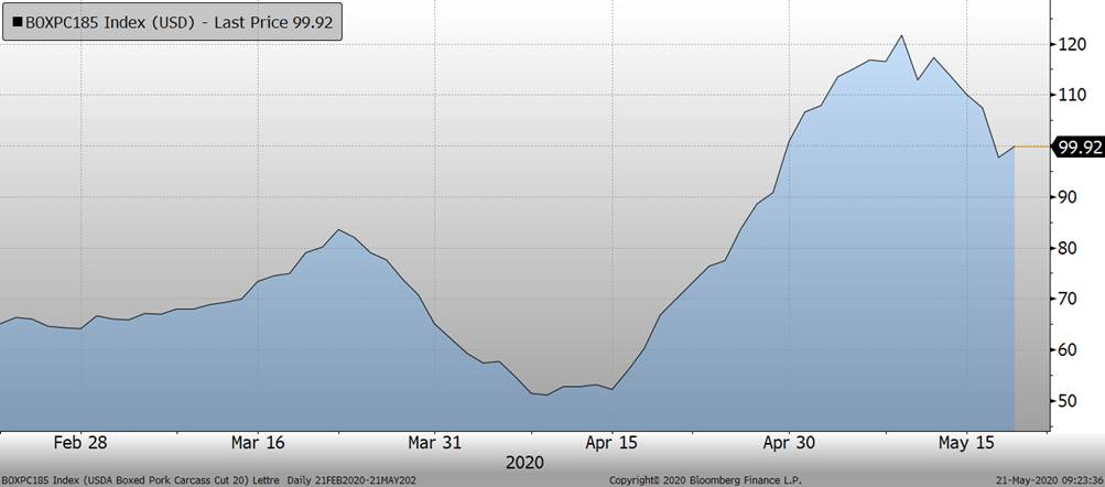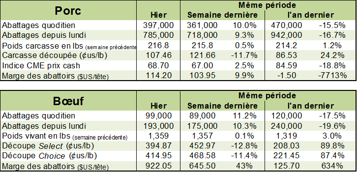 Bien que le prix des découpes a légèrement rebondit hier, en hausse de +2.22c, cela ne compense pas la chute de 22 c/lb depuis 7 jours. La reprise des abattages atténue la pénurie de viande sur le marché américain. Depuis le début de la semaine, les abattages de porc sont à 1.18 M têtes, environ 90,000 de plus que la semaine dernière, mais toujours 15% de moins que l’an dernier.