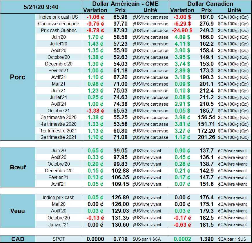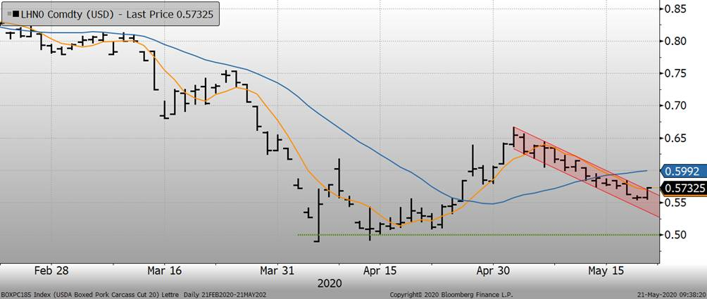 La dépréciation du prix des découpes combinée avec une capacité limitée des abattoirs américains à opérer fait en sorte que les prix à Chicago maintiennent une tendance plutôt baissière depuis 2 semaines. Bien que la valeur des porcs vivant est sous-évaluée comparativement à la valeur de la viande, seul l’appétit des abattoirs pourra justifier une rebond notable ou bien qu’on observe un retour à la normale au niveau des volumes abattus. Aujourd’hui, les prix ont ouvert à la hausse de +1.5c, on demeure dans le canal baissier, mais on est très près de sortir de la tendance (voir graphique). Le prochain support sur juillet est seulement à 50 c/lb. Basée sur l’analyse technique, si le prix brise la tendance baissière, une stratégie pour le mois de juillet serait l’achat du call spread 57 – 65 c/lb combiné avec la vente du 50c put au coût d’une cent la livre.