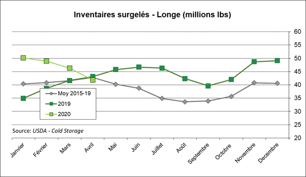 Le rapport Cold Storage de l’USDA, publié hier, démontrait une plus petite baisse des inventaires surgelées au 30 avril que ce qu’on aurait pu s’attendre suite à l’arrêt de certains abattoirs en avril. Dans la volaille, les stocks ont augmenté de 3%, les stocks de porc sont pratiquement inchangés et les réserves de bœuf sont en baisse de seulement -2%. Possiblement que les réserves surgelées diminueront d’avantage en mai, ce qui serait cohérent avec l’exposition de la valeur des coupes de viande observée depuis le début du mois.