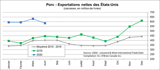 En avril, les exportations nettes de porc des États-Unis a reculé à son plus bas niveau en 2020, à 583 millions lbs, mais demeurent largement supérieures aux ventes de l’an dernier. Les exportations étaient de 641 M lbs, en baisse de 60 M lbs versus le mois de mars, en grande partie expliquée par une diminution des exportations vers le Mexique. Possiblement que le confinement d’avril n’a pas aidé au commerce de viande, puisque plusieurs acheteurs ont diminué leur volume, mais la Chine est venue contrebalancer cet effet avec des achats records de 241 M lbs. C’est pratiquement le quadruple du volume acheté en avril 2019. Les importations de porc ont aussi diminué, à 58 M lbs, ce qui laisse des exportations nettes à 583 M lbs. La croissance des exportations nettes des 12 derniers mois versus les 12 mois d’avant est de +29%.