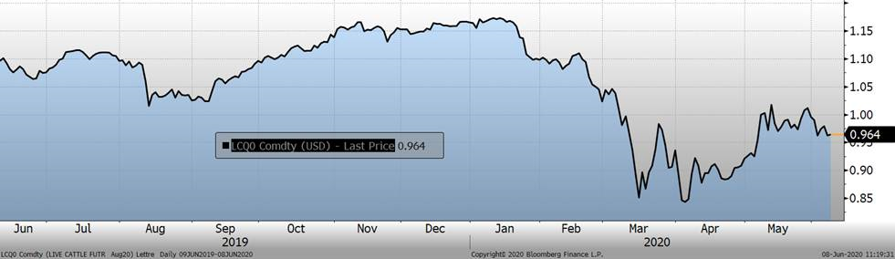 On voit que les porcs en attente cause du tord au prix cash puisque les abattoirs ont le gros bout du bâton dans la négociation du prix. Même si le prix cash était de 53 c/lb à la fin de la semaine et que nous sommes en juin, normalement favorable pour la demande, le marché s’attend à une faiblesse pour encore quelques jours puisque le contrat à terme de juin est à 47.4 c/lb, correspondant au prix cash du 12 juin. Ce sentiment pessimiste ne s’est pas reflété sur les autres échéances lesquelles ont rebondit la semaine dernière. Cependant, si certains traders détiennent des positions d’achat sur juillet, il pourrait être favorable de ne pas attendre à l’échéance avant de rouler les positions sur une échéance plus loin afin d’éviter une divergence entre la faiblesse du cash et la reprise de la confiance sur les mois plus loin. En autant qu’il y aura des millions de porcs en attente, il faudra être vigilent sur les mois rapprochés.