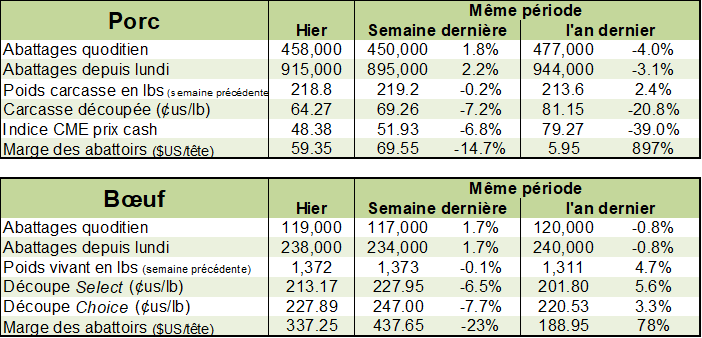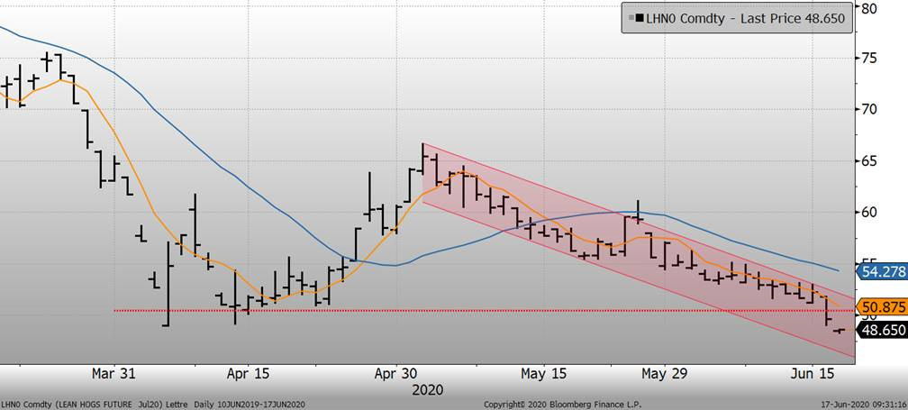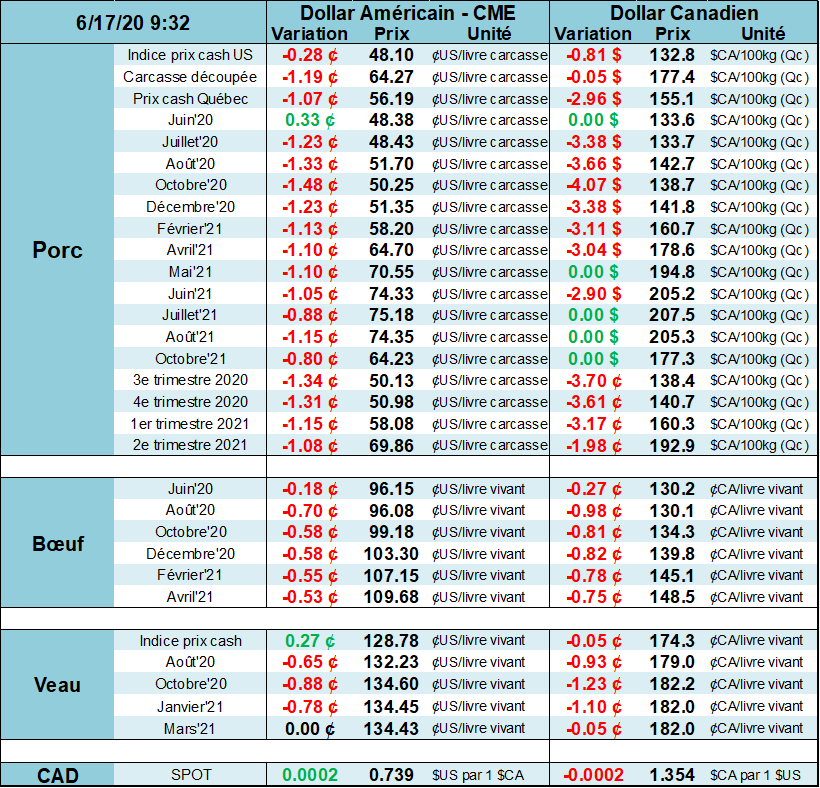 Il n'y a toujours aucun signe de ralentissement de la tendance baissière des contrats de juillet alors que le marché ouvre à la baisse d’une cent ce matin. Les porcs de juillet ont clôturé en forte baisse hier et ont défié les bas du 6 avril. De plus, le prix de fermeture atteint un nouveau creux. La baisse constante des prix des découpes et des prix au comptant maintiennent une pression sur le contrat le plus rapproché, tel que ce fût le cas avec le contrat de juin. À cela s’ajoute un vent d’incertitude autour des achats chinois. L'indice CME au 16 juin était de 48.10, comparativement à 79.27 l’an dernier. La découpe de porc, publiée après la clôture d'hier, s'est établie à 63.54, en baisse de 4.5 cents depuis la semaine dernière. C'est le plus bas prix des découpes depuis le 17 avril. Les abattages de porc estimés par l'USDA a atteint 458 000 têtes hier. Cela porte le total de la semaine à 915 000 têtes, contre 889 000 la semaine dernière, mais en baisse par rapport à 952 000 il y a un an.