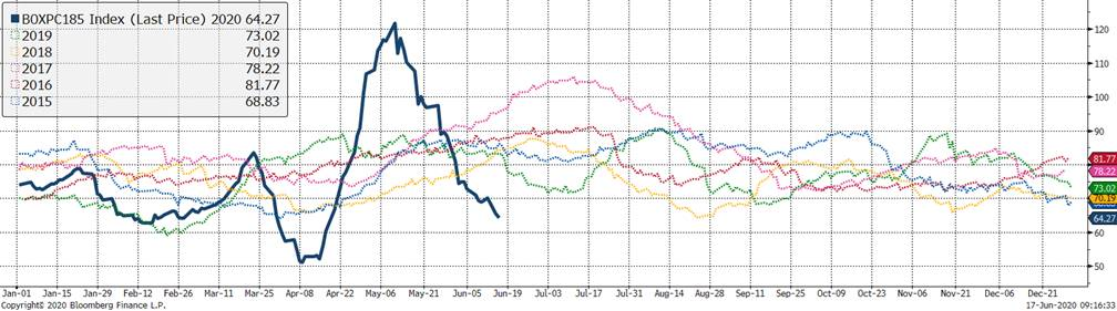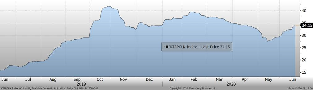Toujours en Chine, selon le chef du bureau de l'élevage du ministère de l'Agriculture, la production porcine chinoise s'est redressée et a été meilleure que prévu en mai, car les stocks de porcs et le nombre de truies reproductrices continuent de croître. Le nombre de truies a augmenté de +3,9% en 1 mois, soit le huitième mois d'augmentation consécutif. Le prix moyen au comptant en Chine au 17 juin était en hausse, à 34.15 CNY/kg, un gain de 24% depuis les creux de la mi-mai.