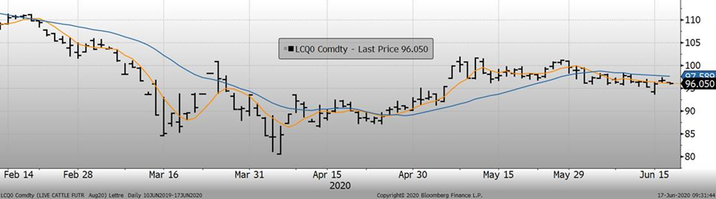 Avec les fondamentaux actuels de la production à venir, la hausse du prix semble quelque peu limitée. Le technique s'est amélioré pour les bovins d'août et le marché rebondit, mais avec l'augmentation de l'offre à venir et l'incertitude persistante sur la demande, la tendance du marché au comptant reste à la baisse. Néanmoins, l'escompte des futures sur le marché au comptant a été noté comme un facteur positif. La découpe de bœuf en boîte de l'USDA était en hausse de 0.72 cents pour le Choice à 227,89 $. Ce montant était en baisse par rapport à 247,00 $ la semaine précédente et était le plus bas prix des découpes depuis le 14 avril. La découpe se rapproche de son prix de 221,82 $ d’il y a un an.