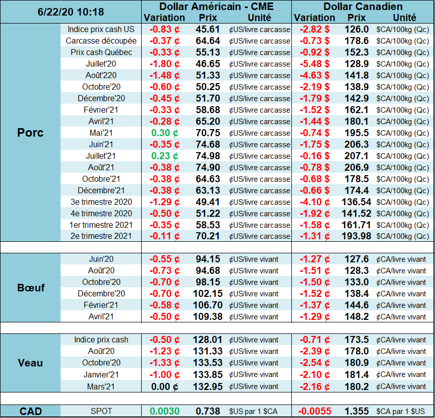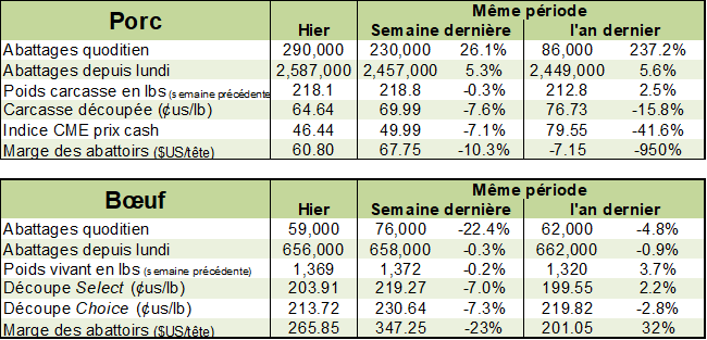 La semaine dernière, l'abattage de porc a atteint 457 000 têtes vendredi et 290 000 têtes samedi. Cela a porté le total de la semaine dernière à 2,587 millions de têtes, contre 2,45 millions la semaine précédente et 2,454 millions il y a un an. On voit donc que la situation est en train de se stabiliser. D’une part, le volume abattu est élevé ce qui permettra découler les porcs en attente. Deuxièmement, le poids des animaux est en baisse, démontrant qu’il y a de moins en moins de porcs en attente. Le dernier facteur à surveiller est le prix du porcelet qui est encore très bas à seulement 14 $US/porcelet de 40 lbs… lorsqu’on verra que l’intérêt des éleveurs à enchérir le prix des achats de porcelet, on saura que les bâtisses se vident et que ce sera une question de semaines avant que le marché du porc revienne à ce qu’on connaît. Pour l’instant, il faut patienter pendant que la chaine de production se replace.