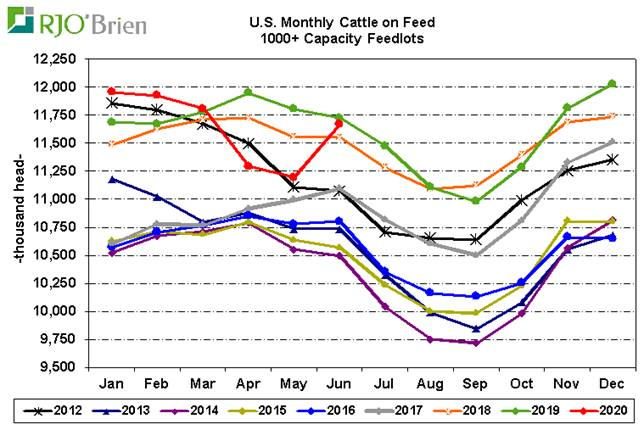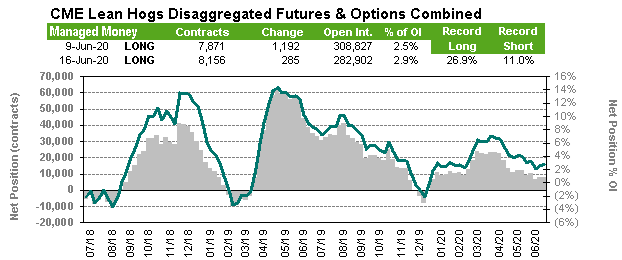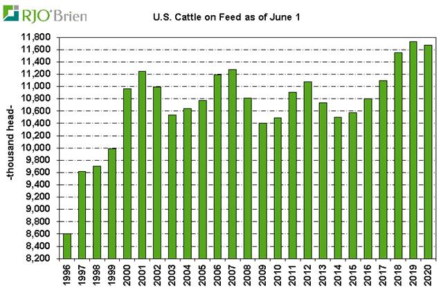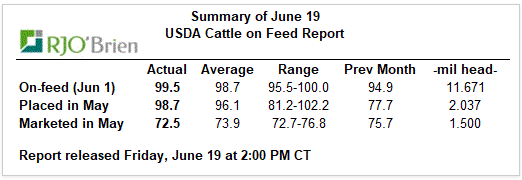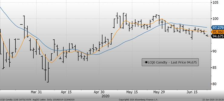 Le rapport Cattle-on-Feed vendredi a été considéré comme baissier sous tous ces angles. Les placements pour le mois de mai ont atteint 98,7% l'année dernière par rapport aux estimations de 96,1% (fourchette 81,2% à 102,2%). Les ventes pour le mois de mai a atteint 72,5% contre les attentes pour 73,9% l'année dernière (fourchette 72,7%-76,8%). Cela a laissé le nombre de bovins en engraissement au 1er juin à 99,5% de l'an dernier, contre les anticipations de 98,7% (fourchette de 95,5% à 100%). Le résultat du rapport est négatif et si le ton du prix cash est plus faible au début de la semaine, le marché semble vulnérable à une correction. La crainte que la Chine n'augmente les restrictions sur les importations de denrées alimentaires a contribué à faire pression sur le marché car cela pourrait forcer le bœuf à être compétitif dans un environnement où les approvisionnements en porc et en volaille gonflent. Ceci est partiellement compensé par la guerre commerciale de la Chine avec l'Australie qui pourrait déclencher une certaine augmentation des ventes de bœuf en Chine.