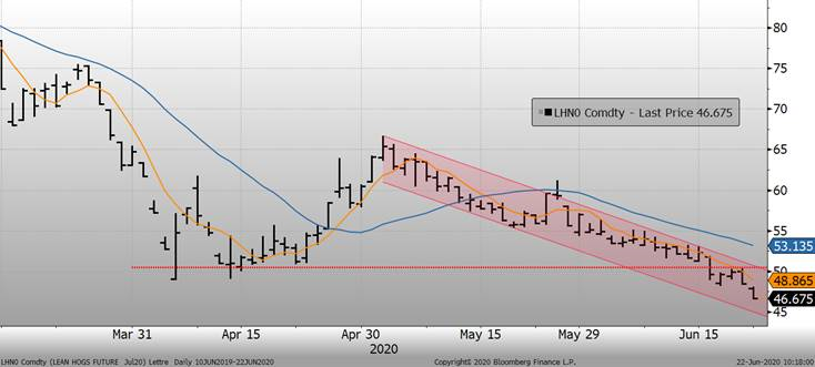 Le marché du porc reste dans une tendance baissière avec des nouvelles court terme à connotation négative pour ce marché. La Chine a suspendu les importations de volaille d'une usine de Tyson Foods où des centaines d'employés ont été testés positifs pour le virus. Cela démontre que les frictions commerciales avec la Chine pourraient s'intensifier à court terme en raison de problèmes douaniers, ce qui pourrait laisser plus de viande aux consommateurs américains à absorber. Les autorités douanières chinoises ont demandé aux exportateurs de produits alimentaires en Chine de signer une déclaration selon laquelle les produits ne sont pas contaminés par le coronavirus. Les traders surveilleront attentivement le rapport de l'USDA Hogs and Pigs ce jeudi. On peut s’attendre à beaucoup de porcs pesants (catégorie 180 lbs et plus) en raison de l'arriérage des livraisons aux abattoirs, mais la quantité de porcelet et les intentions de mises-bas pour le reste de l’année devraient être très faible suite à l’augmentation d'abattage des truies au cours des derniers mois. Cela pourrait être favorable au prix des contrats fin 2020 et 2021. L'abattage cette semaine a augmenté de 5.4% par rapport à il y a un an, les usines revenant à une capacité plus normale. Comme aux États-Unis, les abattoirs du Brésil et en Allemagne ont du mal à contrôler la propagation du virus, on voit donc que le défi est à l’échelle mondial.