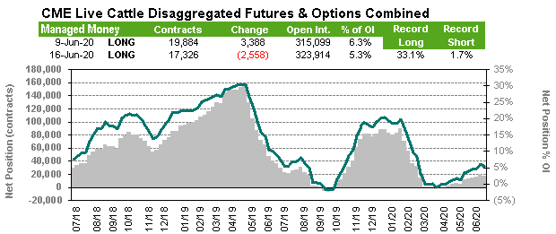 L'USDA a estimé l'abattage de bétail à 119 000 têtes vendredi et 59 000 têtes samedi. Cela a porté le total de la semaine dernière à 656 000 têtes, contre 658 000 la semaine précédente et 668 000 il y a un an. L'abattage a diminué de 1,8% pour la semaine par rapport à l'année dernière et la production de viande bovine a augmenté de 1,5% par rapport à l'année dernière. La découpe de bœuf en boîte de l'USDA était en hausse de 77 cents à la mi-session vendredi et a clôturé en hausse de 16 cents à 213,72 $. Ce montant était en baisse par rapport à 230,64 $ la semaine précédente. C'était la première fois que la découpe augmentait depuis le 13 mai! Vendredi, les bovins vivants au comptant ont été vendus à 98 $. Le prix moyen hebdomadaire du 5-area et cinq jours était de 100,82 $ vendredi après-midi, contre 104,86 $ la semaine précédente. Le rapport de vendredi du CFTC sur les engagements des commerçants a montré que les spéculateur étaient vendeurs nets de 2 558 contrats de bétail vivant pour la semaine se terminant le 16 juin, réduisant leur long net à 17 326.