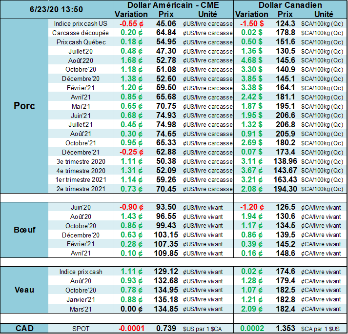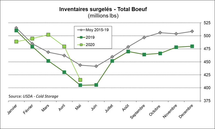 Dans le bœuf, la chute des inventaires surgelés fait en sorte que la quantité de bœuf retourne à la normale. Autrement dit, le surplus des derniers mois a pu s’écouler. À la fin mai, il y avait 415 millions lbs de bœuf, soit 2% de plus que l’an dernier, mais 13% de moins que le mois précédente.