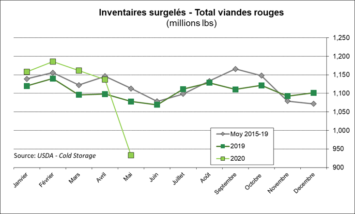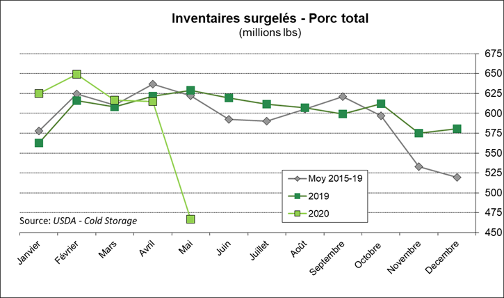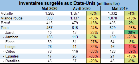 Les problèmes que le COVID a provoqué dans les abattoirs américains se reflètent dans les inventaires surgelés du 31 mai. La viande la plus impactée est celle du porc en baisse de 26% par rapport l’an dernier, à 467 millions de livres. Il faut retourner 9 ans en arrière pour avoir aussi peu d’inventaire surgelé dans le porc, les volumes étaient même plus bas qu’en 2014 avec DEP. C’est surtout les longes (-40%), les côtes (-39%) et le jambon (-28%) dont les inventaires étaient très faibles relativement à l’an dernier.
