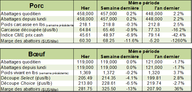 - Porcelets de moins de 50 lbs : Les attentes sont de -2.2% versus l’an dernier, pratiquement autant que la baisse du nombre de truies. Cependant, on voit que des firmes projettent aussi bas de -12%!! C’est ici qu’on pourra constater l’ampleur des avortements durant le trimestre et selon les analystes, ce serait marginal.