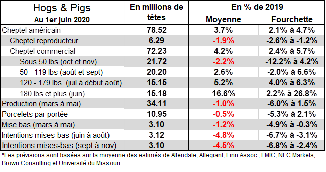 Le rapport trimestriel tant attendu sur le cheptel porcin américain sera publié ce jeudi à 15h00. Évidemment, on a rarement vu un trimestre comme celui de ce printemps et on le voit clairement dans les estimés des firmes sondées. Rappelons que les données reflètent le troupeau au 1er juin, alors que les abattoirs commençaient à peine à reprendre le dessus. Voir le tableau ci-dessous pour les détails.