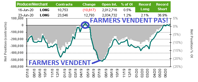 Le tableau suivant montre bien que les farmers ne vendent pas!!! La position commerciale actuellement est NULLE!!!! Normalement quand les famers clanchent la mise en marché, on voit au moins 300-400 milles contrats à la bourse de Chicago pour le hedging. En ce moment, le hedging « commercial » est MORT!.