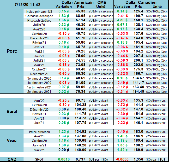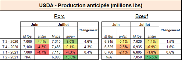 Le USDA a changé son fusil d’épaule lors de la publication du rapport de grains de vendredi. En mai, l’organisme avait réduit considérablement la production de viande de porc pour la fin de 2020, et soudainement dans le rapport de juillet, l’organisme vient de publier que les producteurs allaient produire 9% plus de porcs durant le 3ieme trimestre de 2020 que celui de 2019! Pour le 4ieme trimestre de 2020, le USDA hausse la production de 4% versus le rapport de juin alors que la hausse de production globale est estimée à 0.1% de plus que 2019. Par conséquent, la situation qui devait se révéler optimiste pour le dernier trimestre de l’année vient de prendre du plomb dans l’aile.