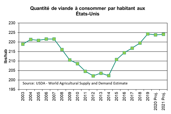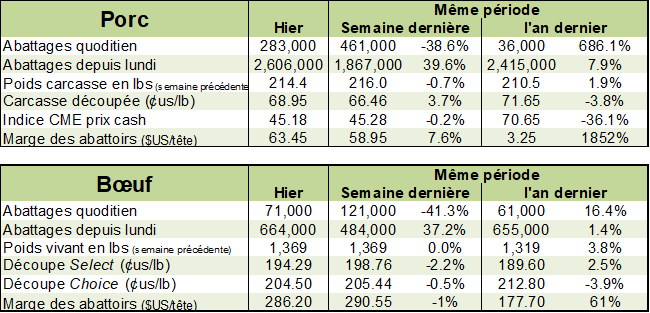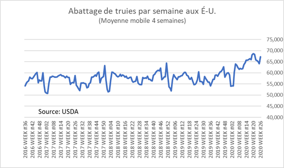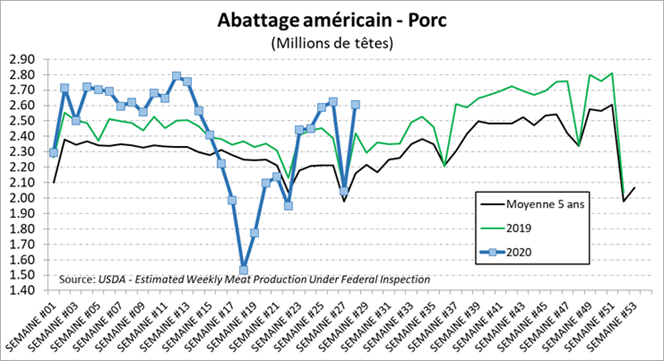 Le marché attend pour prendre une direction plus convaincante. En fait, une tendance claire est difficile à cerner en raison de différents facteurs : (1) le retour à la case départ pour bien des États américains suite aux cas de covid-19 sur leur territoire, (2) des exportations en hausse depuis 2 semaines vers la Chine, (3) des exportations plus lentes vers les autres partenaires américains (Japon et Mexique), (4) des prix chinois en forte hausse depuis 1 mois maintenant et (5) des abattages relativement stables depuis 1 mois.