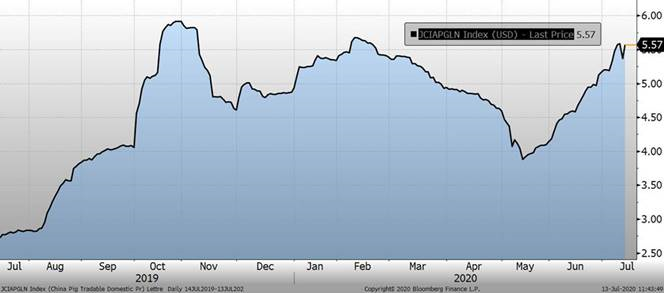 Le prix du porc en Chine depuis 1 mois a repris de l’altitude. Une combinaison de facteurs expliquaient ce phénomène. Le fait de ralentir les importations afin de tester la viande pour détecter la présence du coronavirus a produit un goulot d’étranglement auprès des consommateurs chinois. L’effet de rareté se fait sentir et force les autorités chinoises à vendre du porc provenant des réserves nationales. Le pays va liquider un deuxième lot de 20 000 tonnes. Depuis le début de l’année c’est 430 000 tonnes de viande qui ont été libérées des inventaires chinois. Depuis le début du moi de juillet, le prix chinois a progressé de 6.8% pour se situer à $5.57 USD / kg. On s’approche ainsi du record de prix du mois d’octobre dernier.